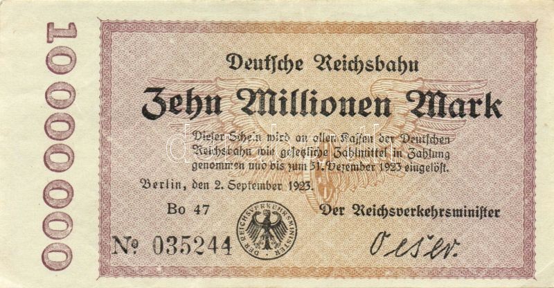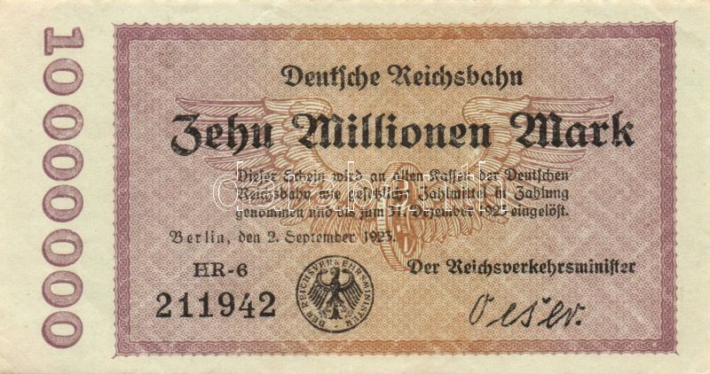 Német Birodalom/Weimari Köztársaság/Német Birodalmi Vasutak/Berlin 192... https://www.darabanth.com/de/95-Fernauktion/95.0/Numismatik/~379/Nemet-BirodalomWeimari-KoztarsasagNemet-Birodalmi-VasutakBerlin-1923-10000000M-2x-klf-s~II219755