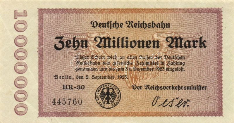 Német Birodalom/Weimari Köztársaság/Német Birodalmi Vasutak/Berlin 192... https://www.darabanth.com/de/95-Fernauktion/95.0/Numismatik/~379/Nemet-BirodalomWeimari-KoztarsasagNemet-Birodalmi-VasutakBerlin-1923-10000000M-2x-klf-s~II219756