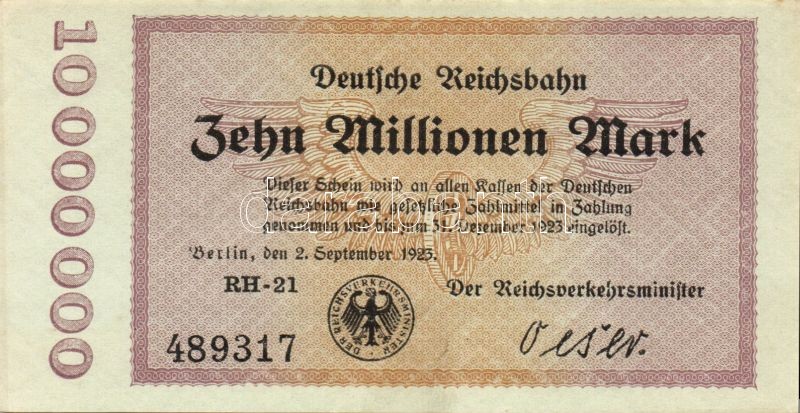 Beschreibung: Német Birodalom/Weimari Köztársaság/Német Birodalmi Vasutak/Berlin 1923. 10.000.000M (2x) klf szériabetű,ill. szériaszám T:I,I-
