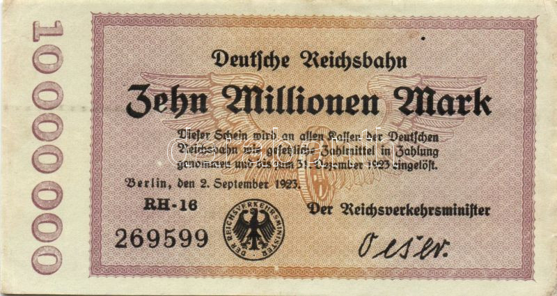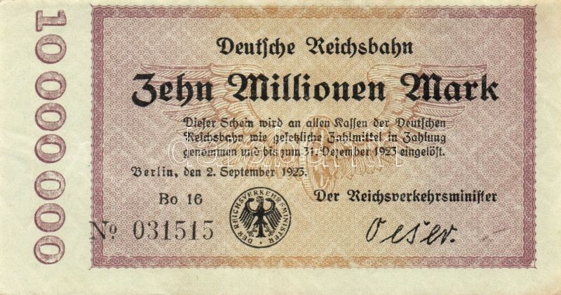 Német Birodalom/Weimari Köztársaság/Német Birodalmi Vasutak/Berlin 192... https://www.darabanth.com/de/95-Fernauktion/95.0/Numismatik/~379/Nemet-BirodalomWeimari-KoztarsasagNemet-Birodalmi-VasutakBerlin-1923-10000000M-2x-klf-s~II219757