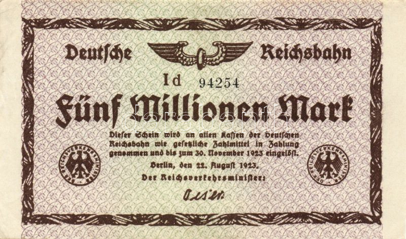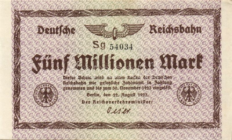 Német Birodalom/Weimari Köztársaság/Német Birodalmi Vasutak/Berlin 192... https://www.darabanth.com/de/95-Fernauktion/95.0/Numismatik/~379/Nemet-BirodalomWeimari-KoztarsasagNemet-Birodalmi-VasutakBerlin-1923-500000M-2x-klf-viz~II219754