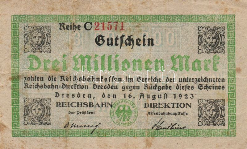 Német Birodalom/Weimari Köztársaság/Német Birodalmi Vasutak/Dresden 19... https://www.darabanth.com/de/95-Fernauktion/95.0/Numismatik/~379/Nemet-BirodalomWeimari-KoztarsasagNemet-Birodalmi-VasutakDresden-1923-3000000M-TIII~II219699