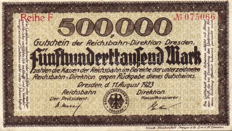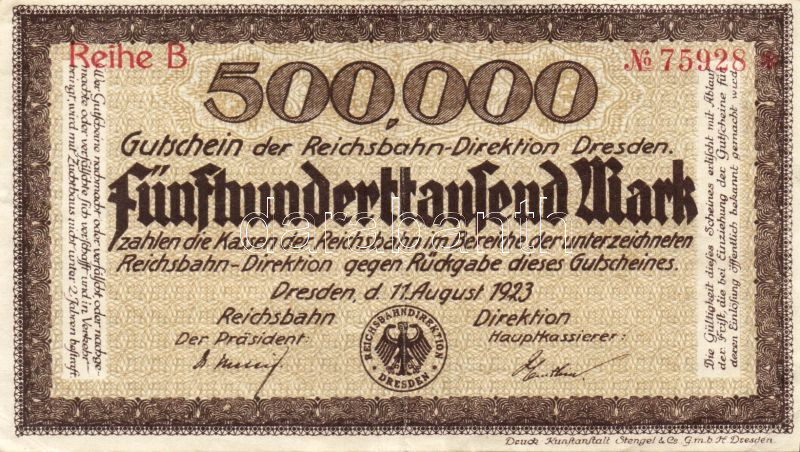 Német Birodalom/Weimari Köztársaság/Német Birodalmi Vasutak/Dresden 19... https://www.darabanth.com/de/95-Fernauktion/95.0/Numismatik/~379/Nemet-BirodalomWeimari-KoztarsasagNemet-Birodalmi-VasutakDresden-1923-500000M-2x-klf-vi~II219703