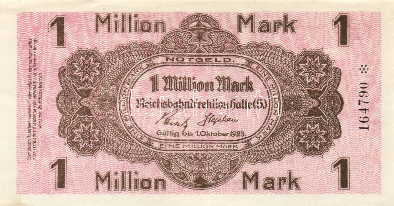 Beschreibung: Német Birodalom/Weimari Köztársaság/Német Birodalmi Vasutak/Halle 1923. 1000.000M T:I- Kis szakadás a felső szélén!