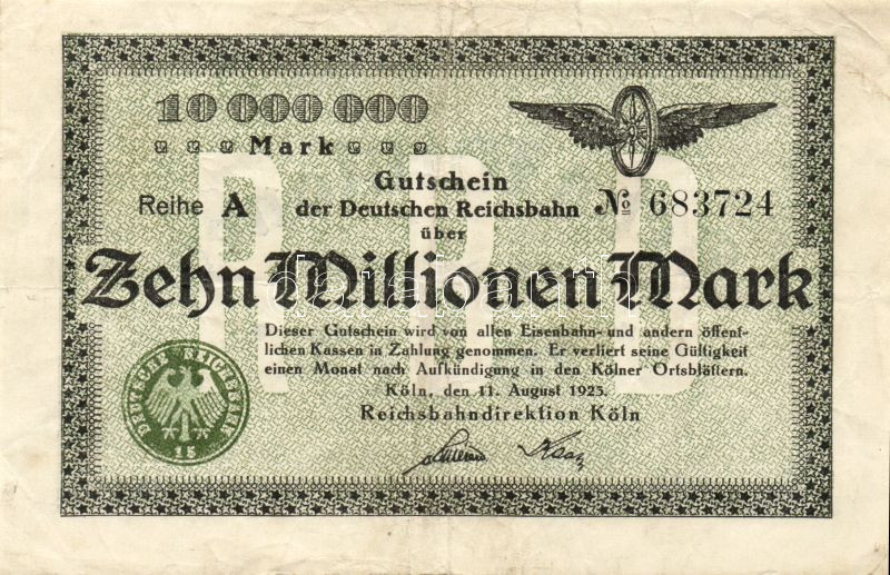 Beschreibung: Német Birodalom/Weimari Köztársaság/Német Birodalmi Vasutak/Köln 1923. 10.000.000M T:II/III+