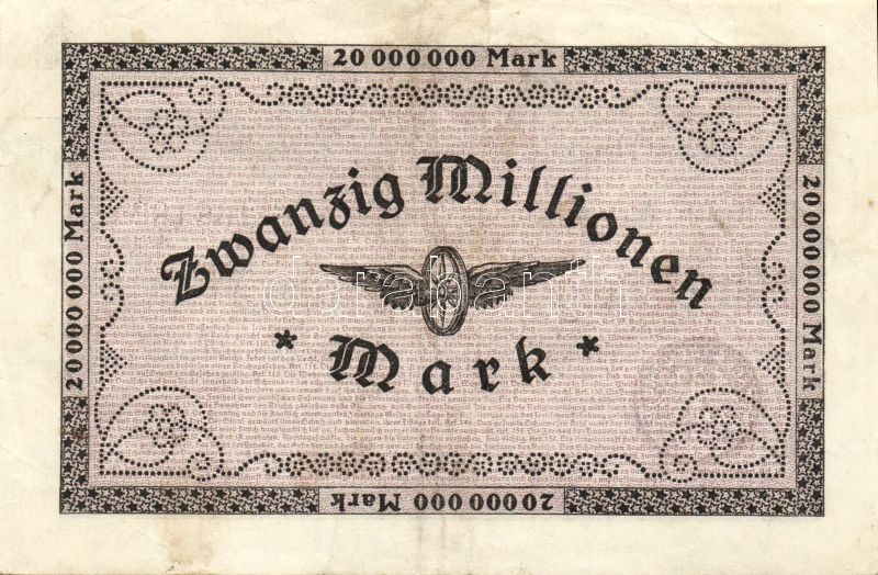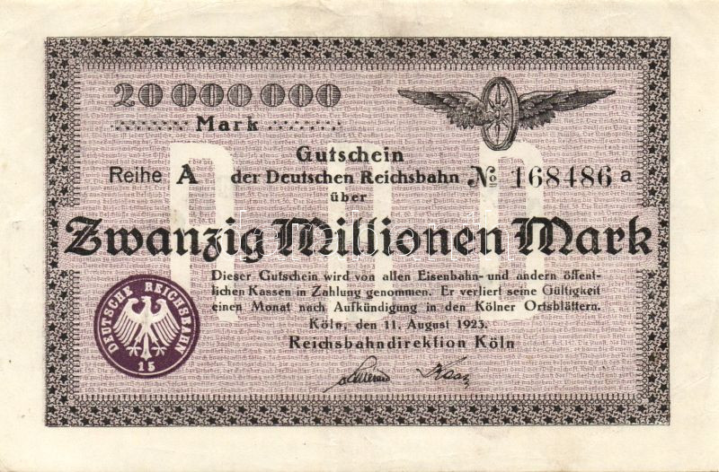 Beschreibung: Német Birodalom/Weimari Köztársaság/Német Birodalmi Vasutak/Köln 1923. 20.000.000M vízjel variáns T:II