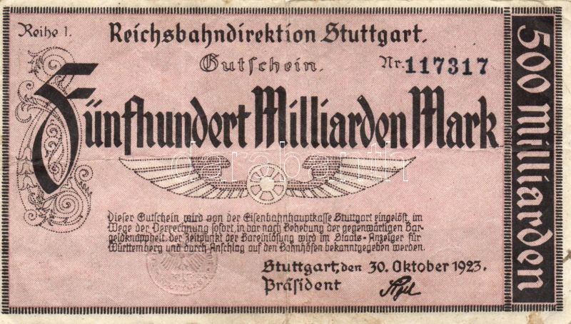 Beschreibung: Német Birodalom/Weimari Köztársaság/Német Birodalmi Vasutak/Stuttgart(Württemberg) 1923. 500.000.000.000M "Reihe 1" T:III/III+