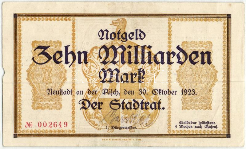 Beschreibung: Német Birodalom/Weimari Köztársaság/Neustadt a.d. Aisch 1923.10.30. 10.000.000.000M T:II- bal szélen kis hiánnyal
