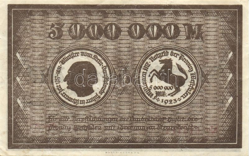 Német Birodalom/Weimari Köztársaság/Poroszország/Westfália 1923. 5000.... https://www.darabanth.com/de/95-Fernauktion/95.0/Numismatik/~379/Nemet-BirodalomWeimari-KoztarsasagPoroszorszagWestfalia-1923-5000000M-TIIplus~II219623
