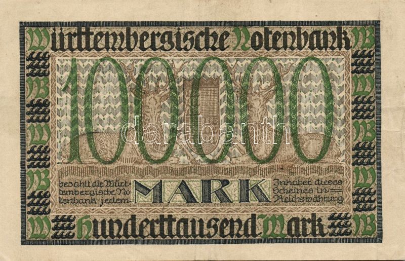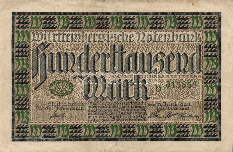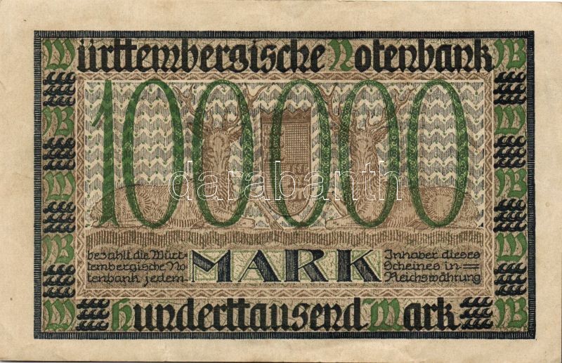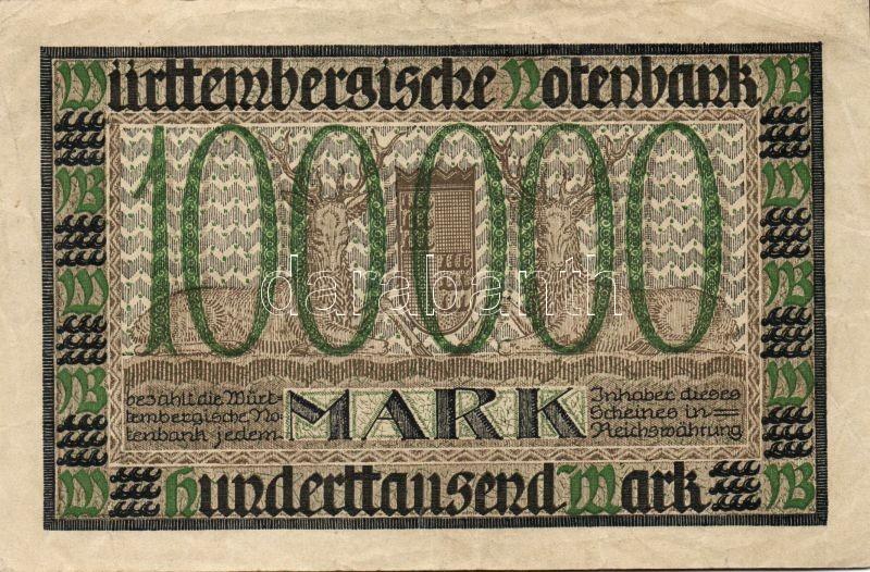 Német Birodalom/Weimari Köztársaság/Württemberg/Württembergische Noten... https://www.darabanth.com/de/95-Fernauktion/95.0/Numismatik/~379/Nemet-BirodalomWeimari-KoztarsasagWurttembergWurttembergische-Notenbank-1923-100000M-3x~II219622