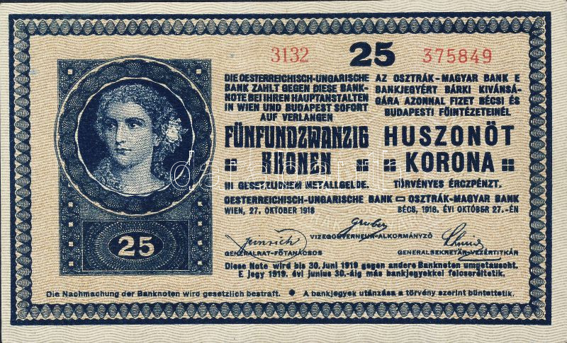 Beschreibung: 1918. 25K "hullámos", sorszám "3"-as száma egyenes felső szárral! T:II+ Csak egyszer hajtva! RR!!