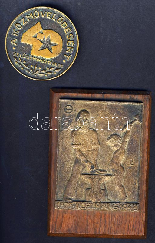 Beschreibung: 1948. "Acélhang" extrém nagyalakú, szögletes Br plakett fára erősítve + DN "A közművelődésért 40év-Belügyminisztérium" nagyalakú Br plakett T:2