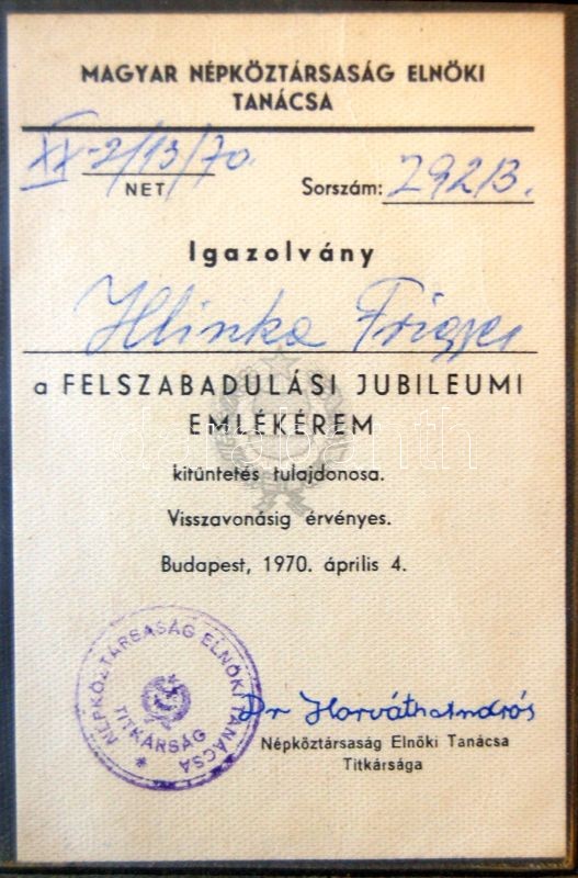 1970. "Felszabadulási Jubileumi Emlékérem" kitüntetés, adományozó okle... https://www.darabanth.com/de/95-Fernauktion/95.0/Numismatik/~382/1970-Felszabadulasi-Jubileumi-Emlekerem-kituntetes-adomanyozo-oklevellel-es-igazolvann~II219251
