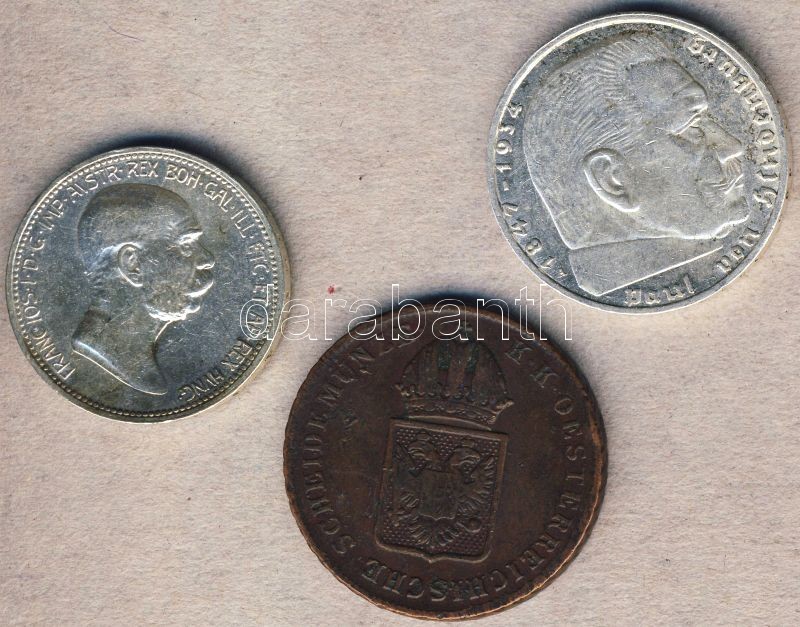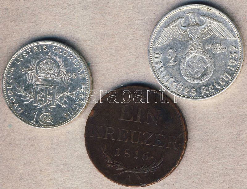 Ausztria 1816. 1Kr + 1908. 1K Ag "Jubileum" + Német 3.Birodalom 1937. ... https://www.darabanth.com/de/95-Fernauktion/95.0/Numismatik/~384/Ausztria-1816-1Kr-plus-1908-1K-Ag-Jubileum-plus-Nemet-3Birodalom-1937-2M-Ag-Hindenburg-T2-3-3klf~II217158