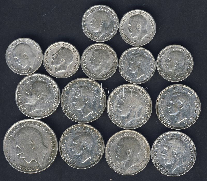 Beschreibung: Nagy-Britannia kis Ag tétel 1921-44. 6p Af (7x) 3klf, 1Sh Ag (7x) 3klf benne skót címer, 1Fl Ag T:2/3,3,3/4 Összesen 15db Ag!