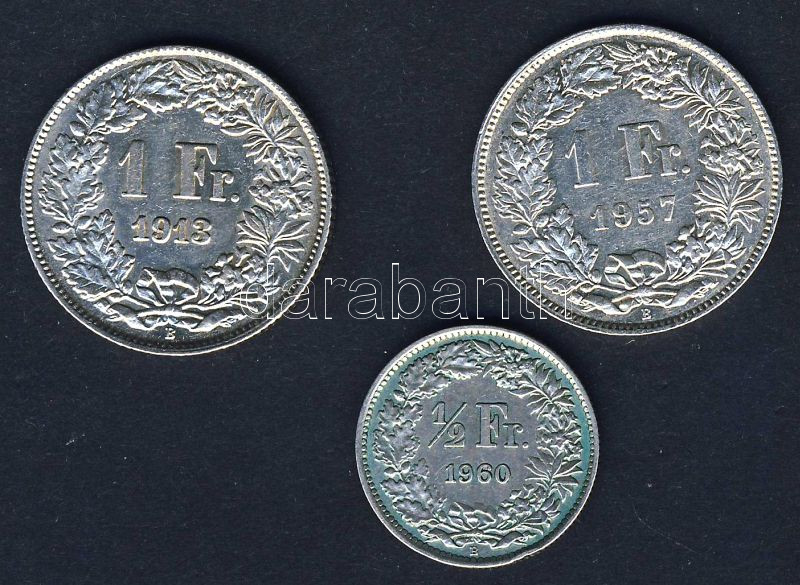 Svájc 1913B + 1957B 1Fr Ag 2klf + 1960. 1/2Fr Ag T:2 https://www.darabanth.com/de/95-Fernauktion/95.0/Numismatik/~384/Svajc-1913B-plus-1957B-1Fr-Ag-2klf-plus-1960-12Fr-Ag-T2~II217106