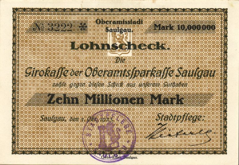 Német Birodalom/Weimari Köztársaság/Saulgau/Lohnscheck 1923.10.1. 10.0... https://www.darabanth.com/de/96-Fernauktion/96.0/Numismatik/~200320/Nemet-BirodalomWeimari-KoztarsasagSaulgauLohnscheck-1923101-10000000M-TI~II221665