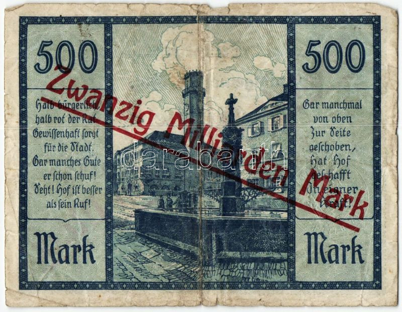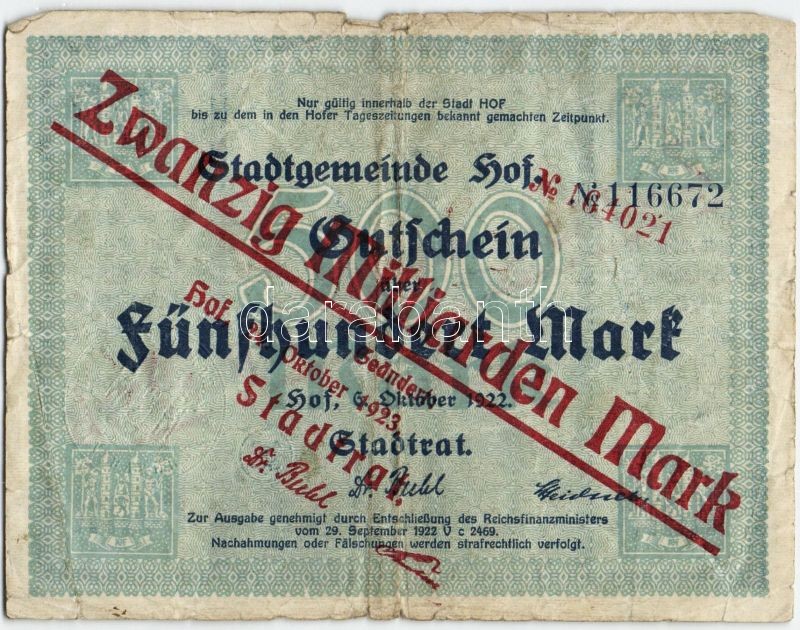 Beschreibung: Német Birodalom/Weimari Köztársaság/Hof 1922.10.6. 500M piros 1923.10.24. 20.000.000.000M fny-sal! T:III-