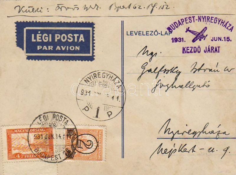 1931.06.14. Budapest - Nyíregyháza első repülés levelezőlap / Erstflugkarte