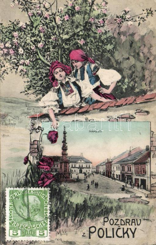 Policka with folkwear, and bank, pub on the square, with ad of Otto Martin