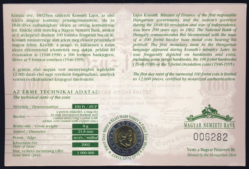 2002. 100Ft "Kossuth" elsőnapi veret sorszámozott díszlapon T:BU Csak ...
