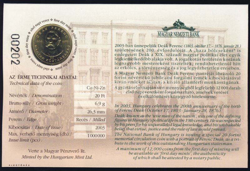 https://www.darabanth.com/en/100-Online-auction/100.0/Numismatics/~100022/2003-20Ft-Deak-Ferenc-elsonapi-veret-szamozott-emleklapon-T2-Csak-12000db~II237345