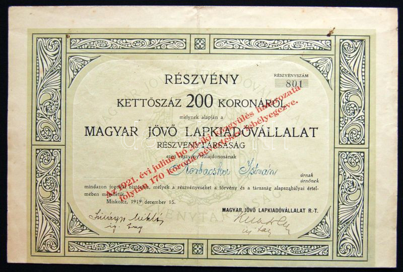 1919. "Magyar Jövő Lapkiadóvállalat Részvénytársaság" részvénye 200K-ról