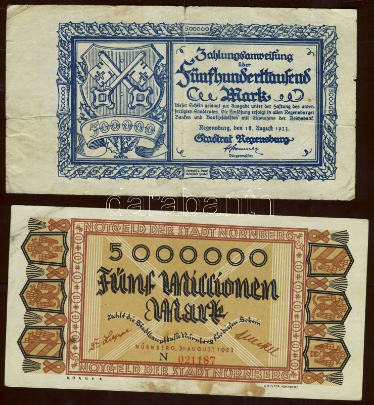 https://www.darabanth.com/en/101-Online-auction/101.0/Numismatics/~30011/Nemet-BirodalomWeimari-Koztarsasag-Nurnberg-5000000M-plus-Regensburg-500000M-TIII~II240408