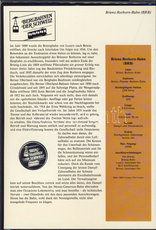 Svájc DN "Brienz-Rothorn vasút" Ag emlékérem 15,22g emléklapon T:PP