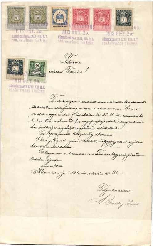 1914 Kérvény mozgókép előadás megtartására Körmöcbányán okmánybélyegekkel