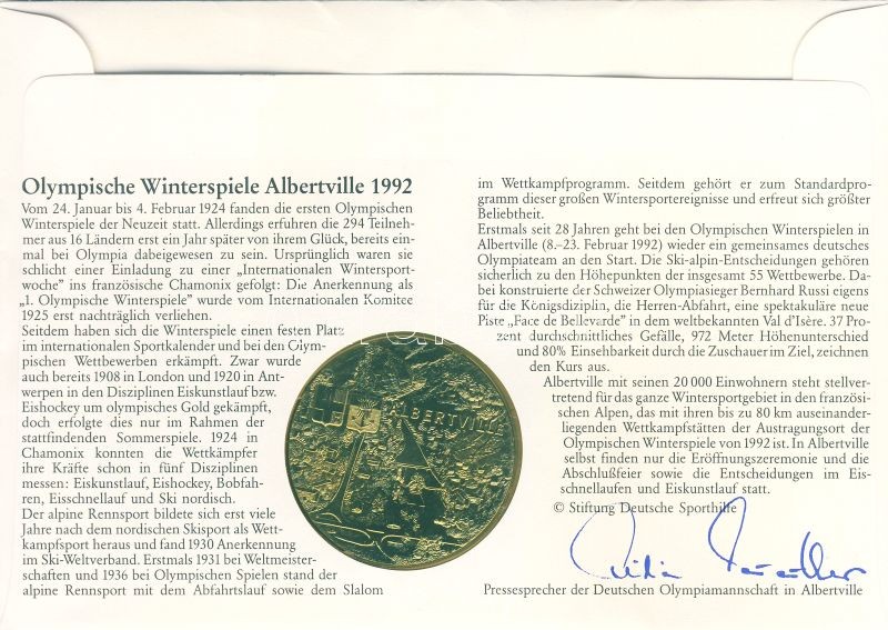 NSZK 1992. "Olimpia-Albertville" ffém emlékérem érmés, bélyeges boríté...