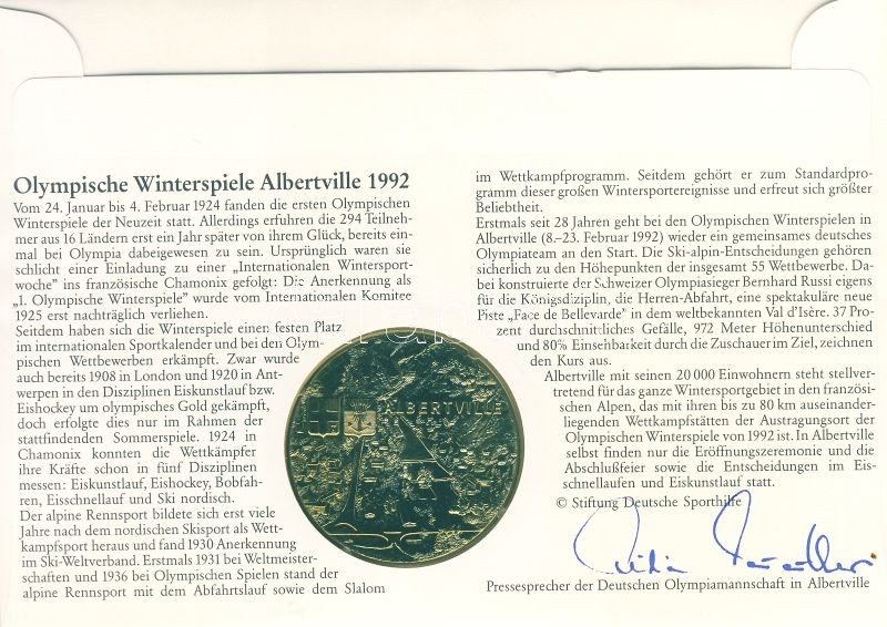 NSZK 1992. "Olimpia-Albertville" ffém emlékérem érmés, bélyeges boríté...