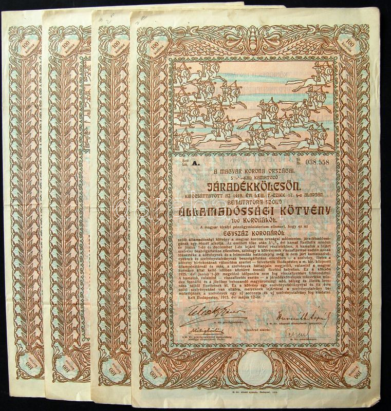 1912. Járadékkölcsön államadóssági kötvény 100K-ról (4x) 3x egymásutáni, 1x egyugrású sorszámmal, szelvényekkel