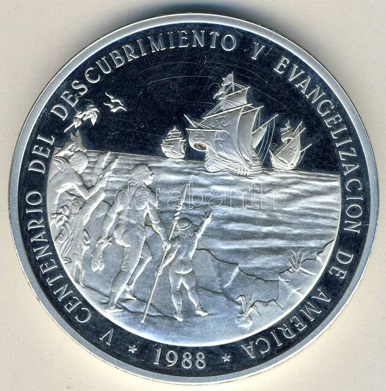 Dominika 1988. 100P Ag "Amerika felfedezése-őslakosok, Kolumbusz hajói" 155,53g színezüst! T:PP Csak 5300db! Eredeti díszdobozban!