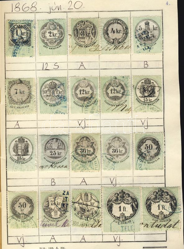 1868-1946 200 db magyar okmánybélyeg cserefüzetben, kiadások szerint feldolgozva