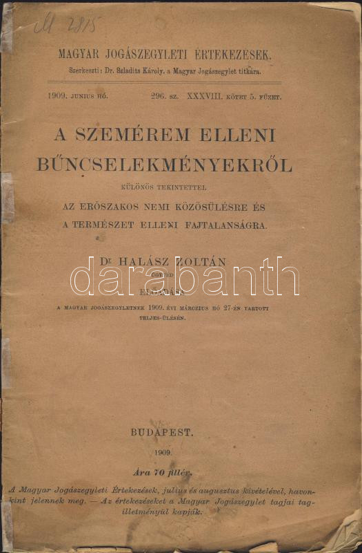 1909 Dr. Halász Zoltán: "A szemérem elleni bűncselekményekről" írt 50 ...