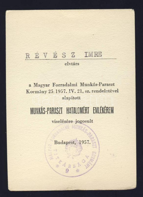 https://www.darabanth.com/en/108-Online-auction/108.0/Other-collectibles/~330/1957-A-Munkas-Paraszt-Hatalomert-kituntetes-igazolvanya-Revesz-Imre-elvtars-reszere~II265808