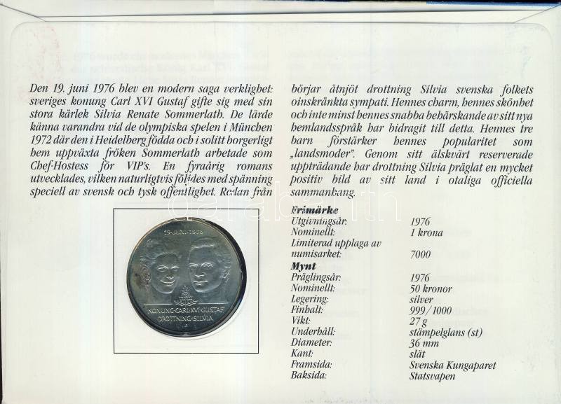 Svédország 1976. 50K Ag "Szilvia és Károly" bélyeges érmés borítékon T:1 hátoldali ismertető tanúsítvánnyal Csak 7000 db!