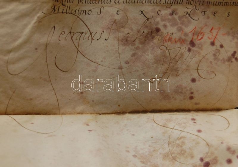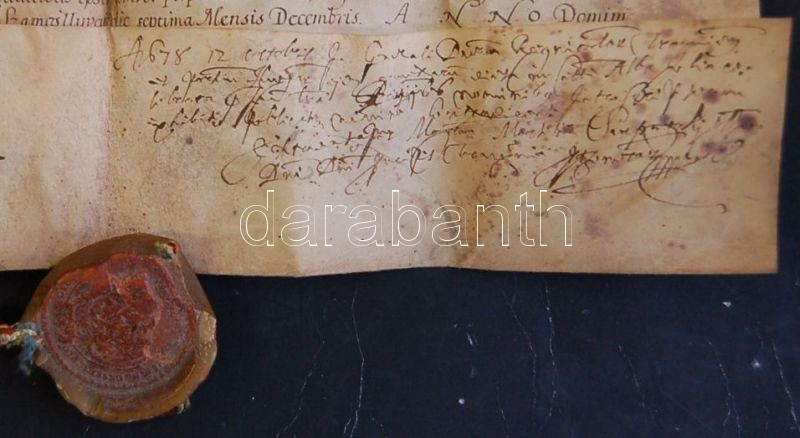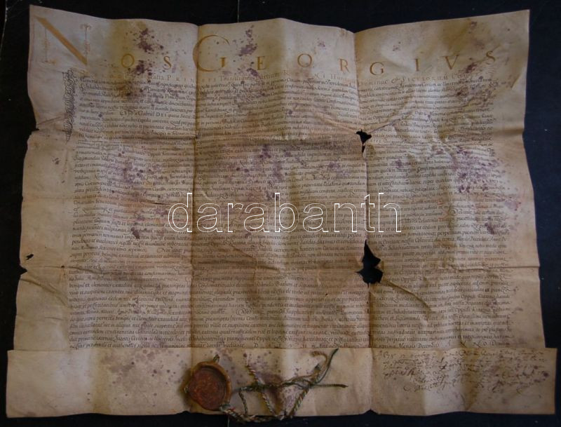 1641 Rákóczi György adománylevele Kraszna városának, melyben megerősítő a Báthory Gábor által adományozott vásártartási jogot. A fejedelem saját kezű aláírásával és sérült függőpecséttel (megviselt állapotban) / Benefaction-letter of Georgius Rakoczi in which he confirms the right of city Kraszna to hold fairs. With autograph signature of the monarch. (damaged) 70x60 cm