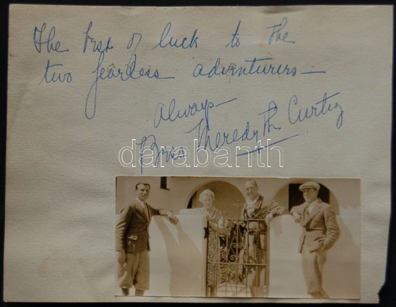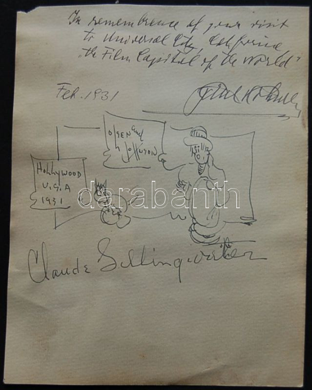 1931 Olsen and Johnson hollywoodi színészek, komikusok eredeti rajza és aláírása Bartha Gyula és Sulkowszky Zoltán világ körüli motorosoknak. Hátoldalén Kertész Mihály feleségével és amotorosokkal közös fotója, Meredith Curtiz aláíárásával / Original drawing and autograph of Hollywood movie star Olsen and Johnson for the world-traveller Hungarian bikers Bartha and Sulkowszky. On the backside photo of Michael Curtiz with his wife together with the bikers, plus autograph of Meredith Curtiz
