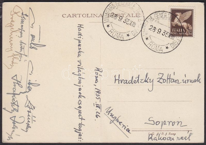 Description: 1935 A római hadipuska világbajnokság dekoratív képeslapja megfelelő alkalmi bélyegzéssel, a magyar hadipuska világbajnok csapat tagjainak eredeti aláírásával / Military gun world championship postcard with special cancellation and autograph signatures of the members of the world champion Hungarian team
