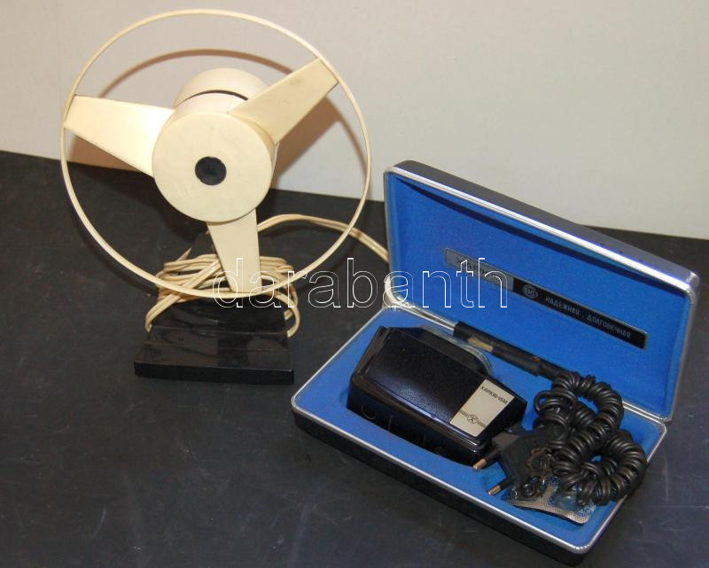 Nosztalgia tétel, benne: XAPKIB márkájú, orosz villanyborotva dobozában illetve egy régi asztali ventilátor