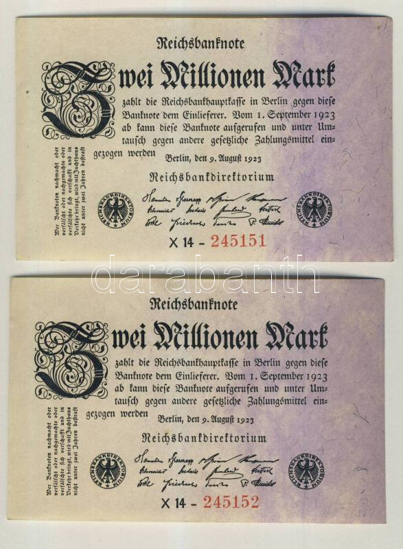 Német Birodalom / Weimari Köztársaság 1923. 2.000.000M (2x) egymás utáni sorszámokkal T:I