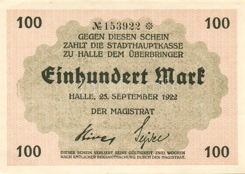 Német Birodalom/Weimari Köztársaság/Halle 1922.09.25. 100M (2x) egymásutáni sorszámmal T:I,I-