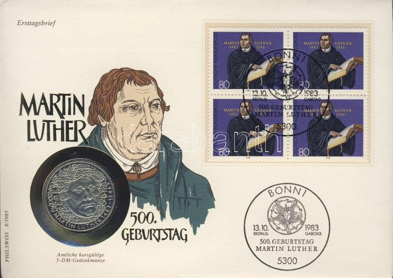 NSZK 1983. 5M "Martin Luther" érmés, bélyeges borítékon, alkalmi bélyegzővel T:1