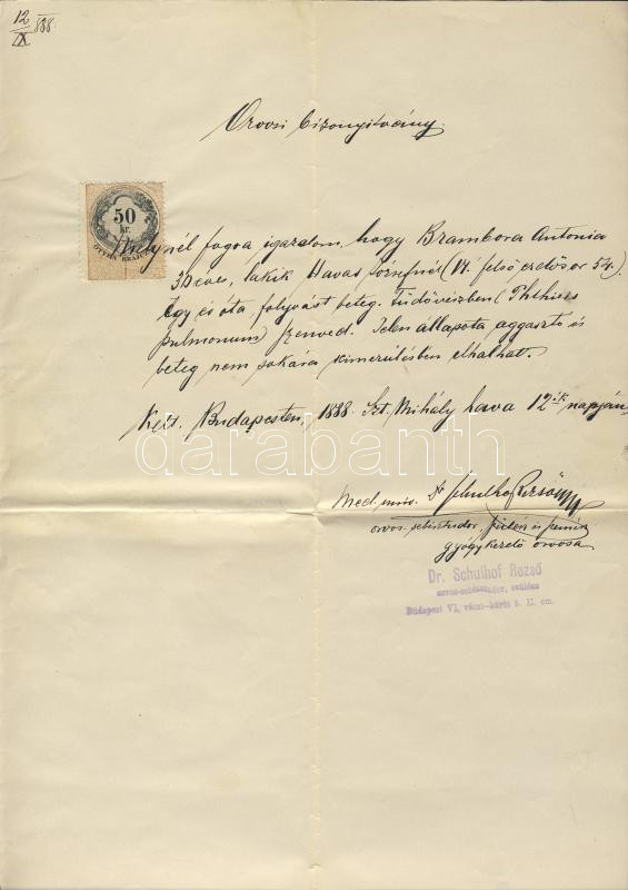 1888 Dr. Schulhof Rezső orvostudor autográf levele 50kr okmánybélyeggel