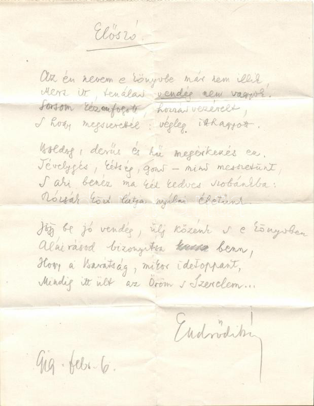 Endrődi Béla író, újságíró kézzel írott és aláírt verse