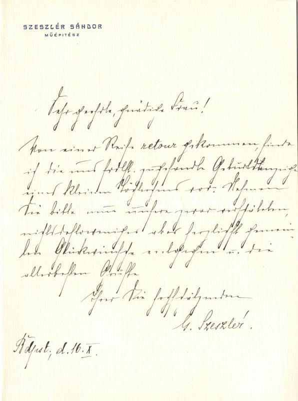 Szezslér Sándor műépítész (Hauszmann Alajos tanítványa) kézzel írott levele