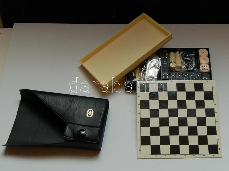 Csepel Művek jelzéssel ellátott mágneses sakk, malom és dominó készlet bőrtokban