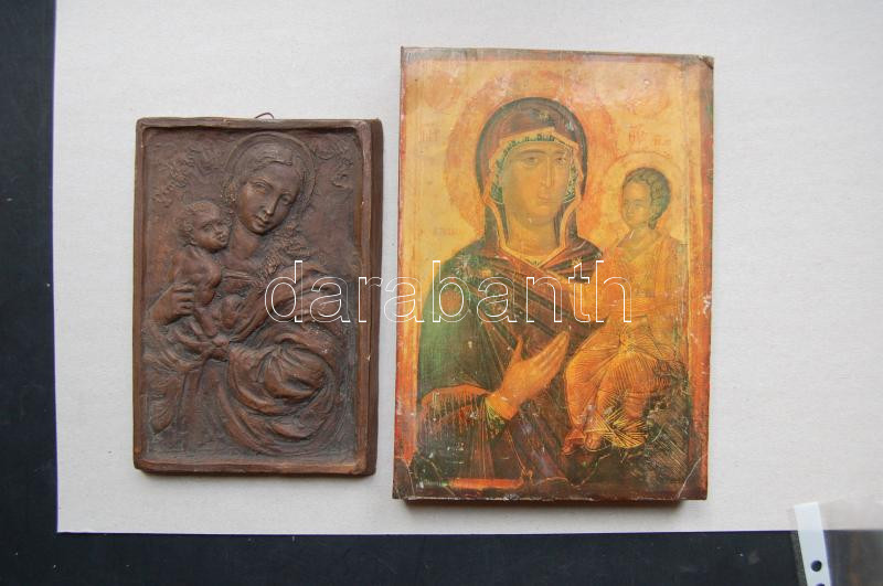 Kis egyházi tétel, benne: fa ikon utánzat egy XVII. századi alkotásról (21x14cm) és egy Szűz Máriát ábrázoló agyag bérmálkozási ajándék (17x12cm)